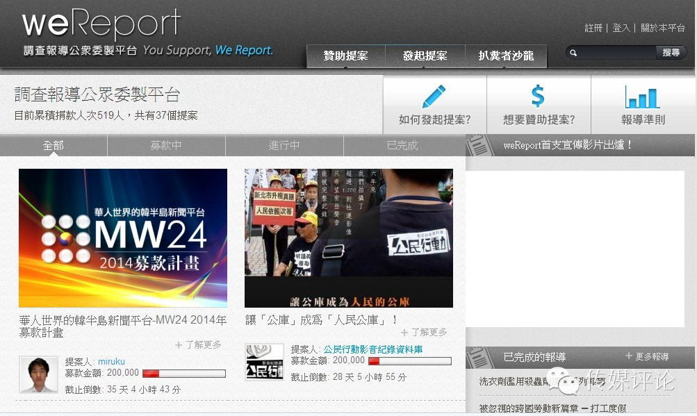这种更多的向公众募集资金与商业企业为了经济利益资助采写新闻有所区别。We Report认为,新闻业并非企业财团型媒体的专利,唯有公民参与新闻生产的行列,并以具体行动支持优秀的新闻业,新闻才能成为我们公共生活的良伴。为了更好地让捐助者与执行者达成一致意见,We Report一是设立了浏览回应功能,参与者可以对报道者的计划提出意见建议,让报道者修正或者调整自己的项目提案;二是设立“扒粪者沙龙”,如果网友有什么认为值得调查的选题,但自己又无法执行,可以在那里公布,供大家讨论,并让有兴趣者操作。也就是说,发起项目、制造项目或者捐助项目都成了大家参与选题选定,集体制造新闻的参与方式。这种“大众参与的传播”的新闻创新,最初被寄以替代现有“对大众的传播”新闻生产模式的终接者的功能。