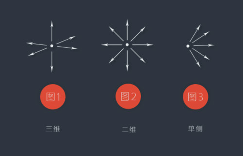 光源的发散是立体的,是向三维空间内的所有方向(图1),为了便于分析,在此我们将其简化为一个二维的传播方向(图2),又因为物体一般只会在光源的一侧,且台灯、闪光灯、日光等都只会朝一个方向照射,故再将点光源简化为向单独一边传播(图3)。