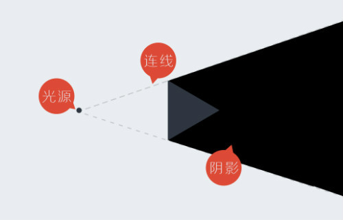 由于前文提到的光向量向所有地方均匀发射,布满整个空间,所以在光向量能达到的地方均被照亮,在不透明物体的遮挡下,光向量到达不到的地方出现阴影,且因为光向量沿直线传播,故点光源与物体边缘的连线(图中虚线所示)之内便是阴影,阴影的边缘是一条直线。