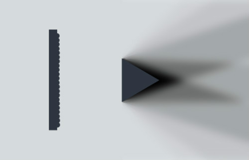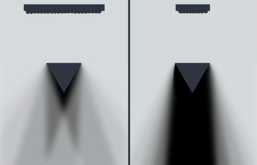 我们将点光源与物体边缘分别连线,再通过PS的图层叠加,可以发现从阴影到亮部出现了多个层次,每个层次的亮度从亮处依次递减直到纯黑,对比点光源的图,可以明白层次的产生是由于点光源个数的增多,虚线以内的部分产生了叠加,发挥想象力,当面光源不再是由有限个点光源替代的时候,无数个层次将会覆盖整个α角,阴影到亮部之间将会产生柔和的渐变效果。通过高斯模糊来模拟这一情况如下: