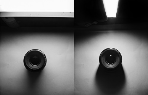 为了验证以上结论,取一个非透明实物(小痰盂),将条形台灯(大光源)从斜上方照射物体,并拍照(左图),此时为了实验的单变量性,保持其它元素不变,只用不透明遮挡物将光源遮挡成狭窄的细缝(小光源),并拍照(右图),通过实际拍摄,所产生的效果如下,可以在图中看到,左边的影子与右边相比小且边缘柔和,右边的影子大且硬朗,通过对比分析图,与实验结果大致相同。